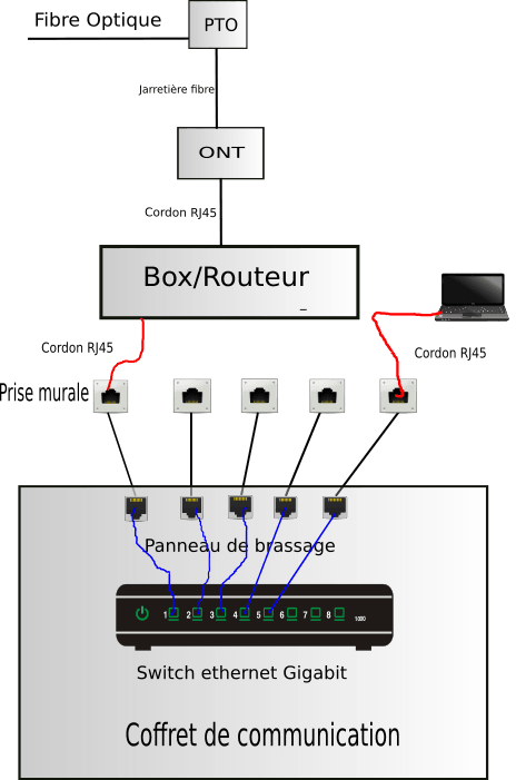 Le switch sera branché sur la prise de brassage arrivant du salon pour recevoir le réseau et le switch redistribue le réseau en y connectant les 3 autres prises de brassage.