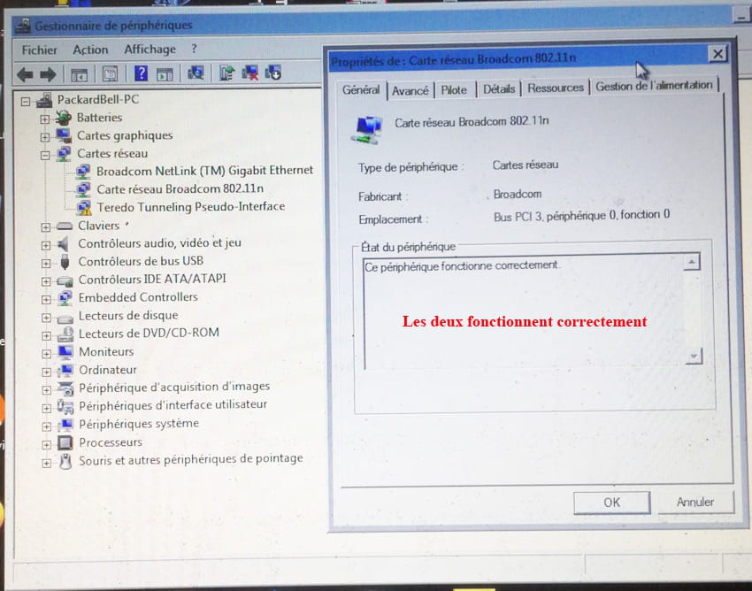 Première configuration, avec un disque dur en "Caution" et un WD 7 pas authentique, tout fonctionne , très lentement certes mais une fois "chaud" tout marche, Internet en Wifi et par câble et tout le reste. Le gestionnaire des périphériques affiche ceci