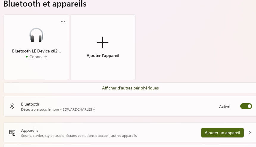 Ici, il est écrit le nom d'un casque nommé Bluetooth Le Device et le son ne passe pas.