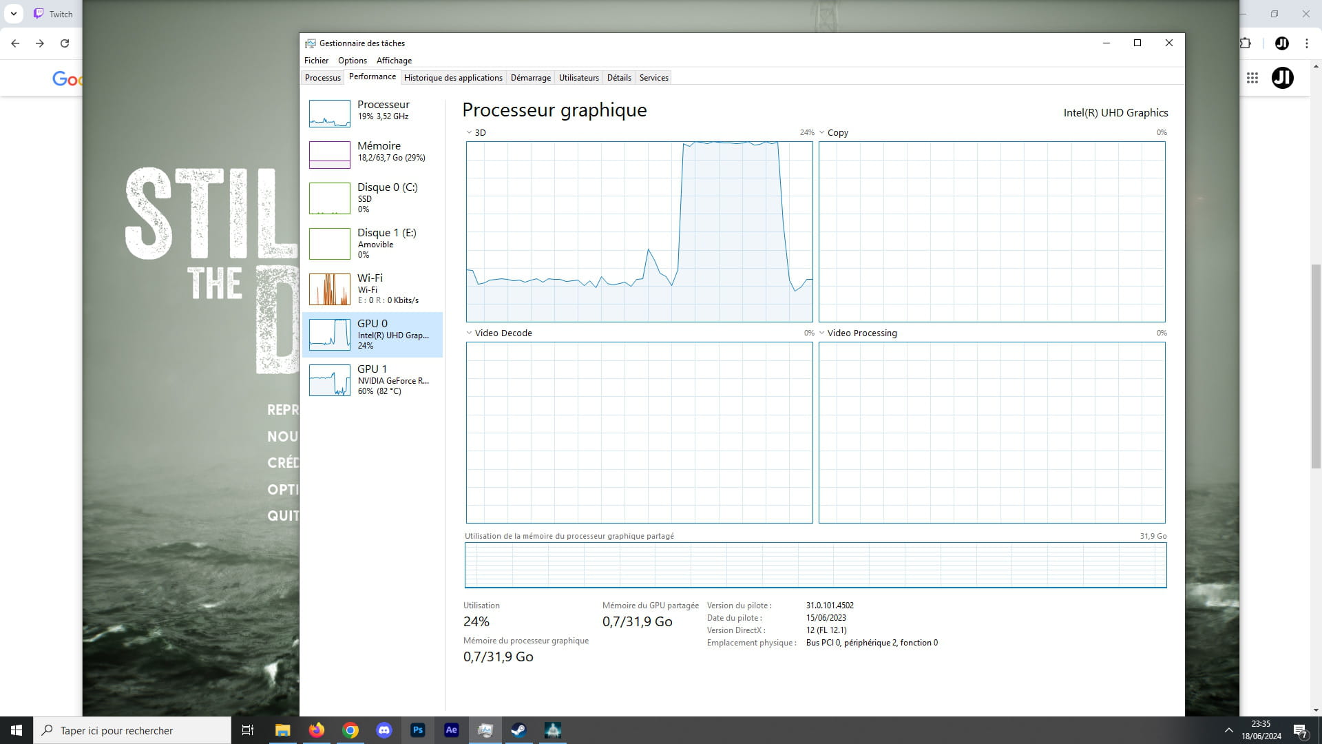 Je vous contacte car je rencontre depuis quelques temps un problème sur la grande majorité des jeux. Quelle que soit le niveau de graphisme, j'ai régulièrement de grosses pertes de fps. En faisant tourner un jeu en fond avec mon gestionnaire des tâches, j'ai découvert que mon GPU0 tournait à fond et que mon GPU1 ne faisait plus grand chose lors de ces lags.