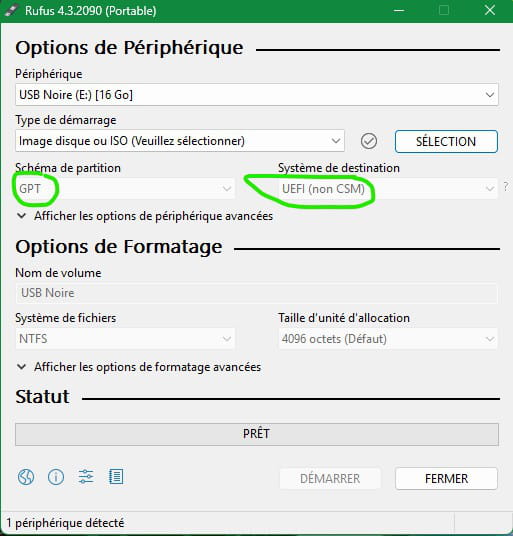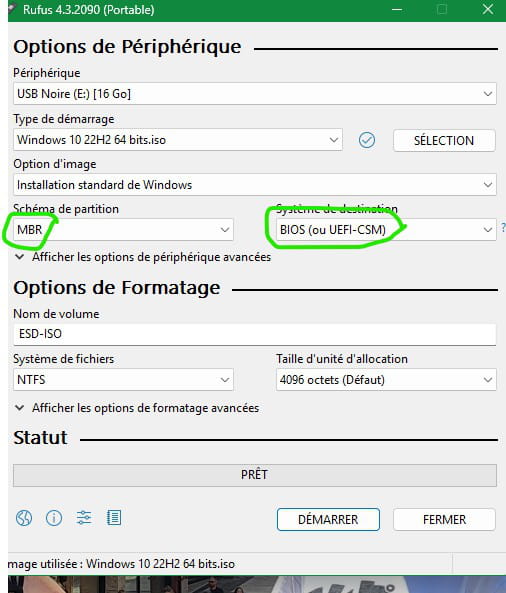 Bios LEGACY ou mode hérité il faut disque et clé en MBR.