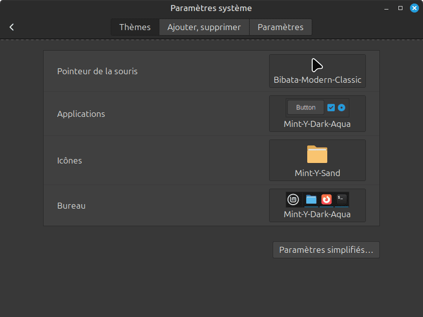 Lance ensuite le gestionnaire de paramètres, dans Thèmes active l'affichage détaillé puis clique sur curseurs et tu verras le nom de ton jeu de curseurs apparaître dans la liste, tu le sélectionnes simplement et il devient immédiatement actif (déplace ta souris pour voir).