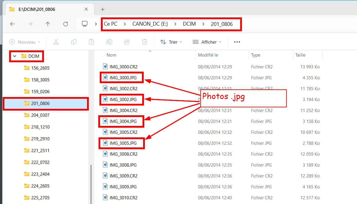 Sur la capture d'écran on voit le contenu du dossier 201_0806 (sous-dossier de DCIM). Il contient des photos directement visibles et des fichiers raw qui doivent être traités. Vous n'avez probablement pas de fichiers raw.