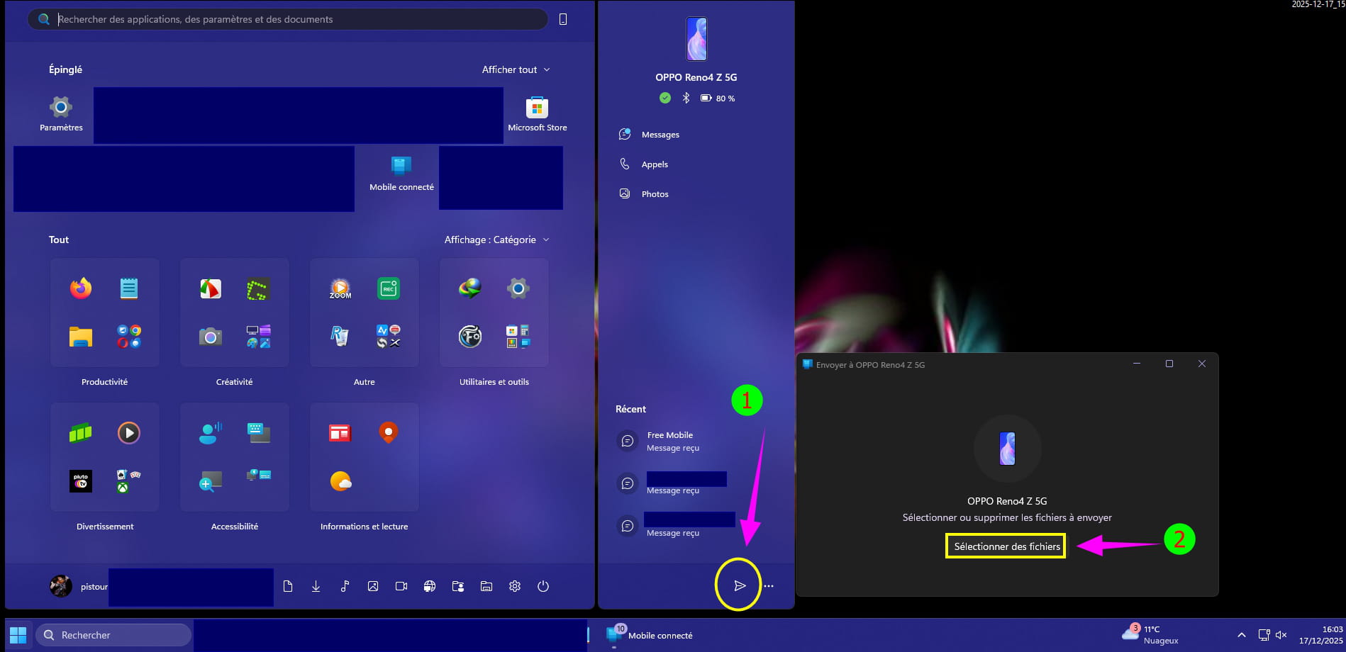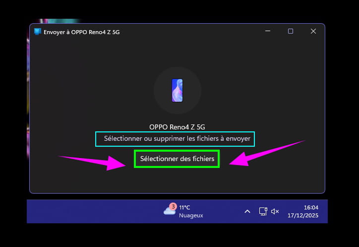 L'option ''envoyer directement depuis des fichiers votre PC vers votre téléphone'' fonctionne.