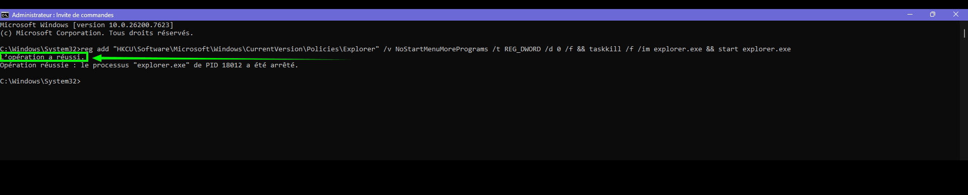 reg add "HKCU\Software\Microsoft\Windows\CurrentVersion\Policies\Explorer" /v NoStartMenuMorePrograms /t REG_DWORD /d 0 /f && taskkill /f /im explorer.exe && start explorer.exe