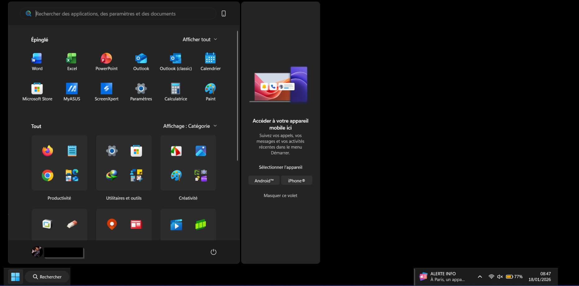 Mobile Connecté sur le menu démarrer Windows 11version 24h2