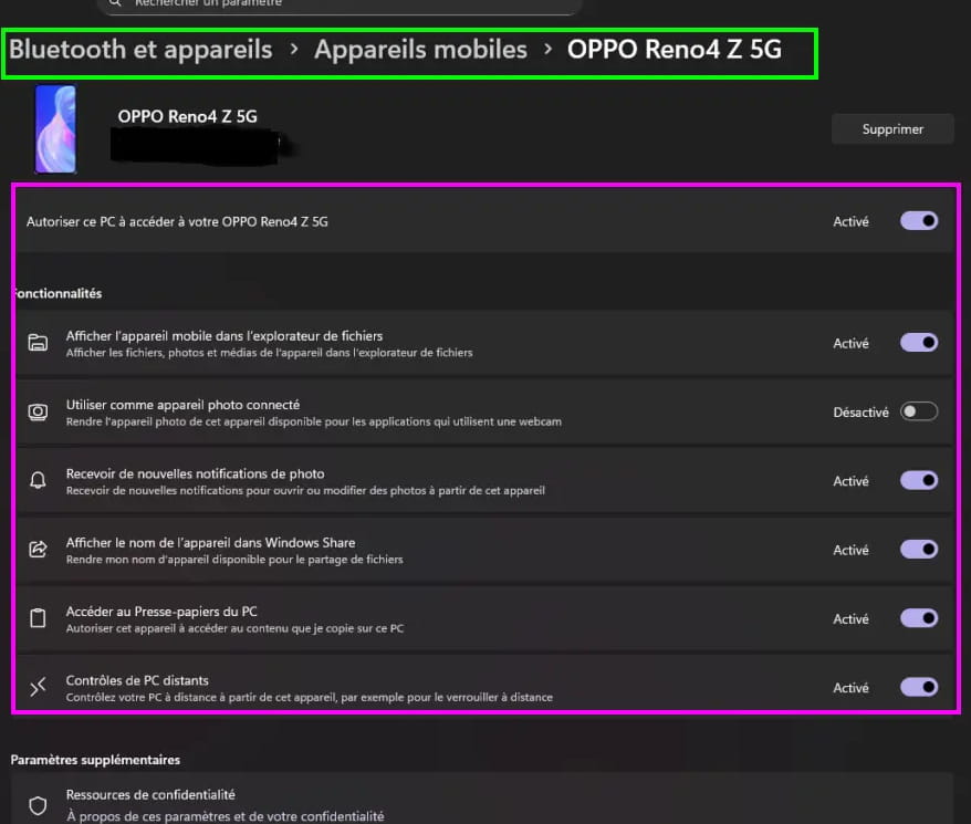 Allez dans Paramètres > Bluetooth et appareils > Appareils mobiles :