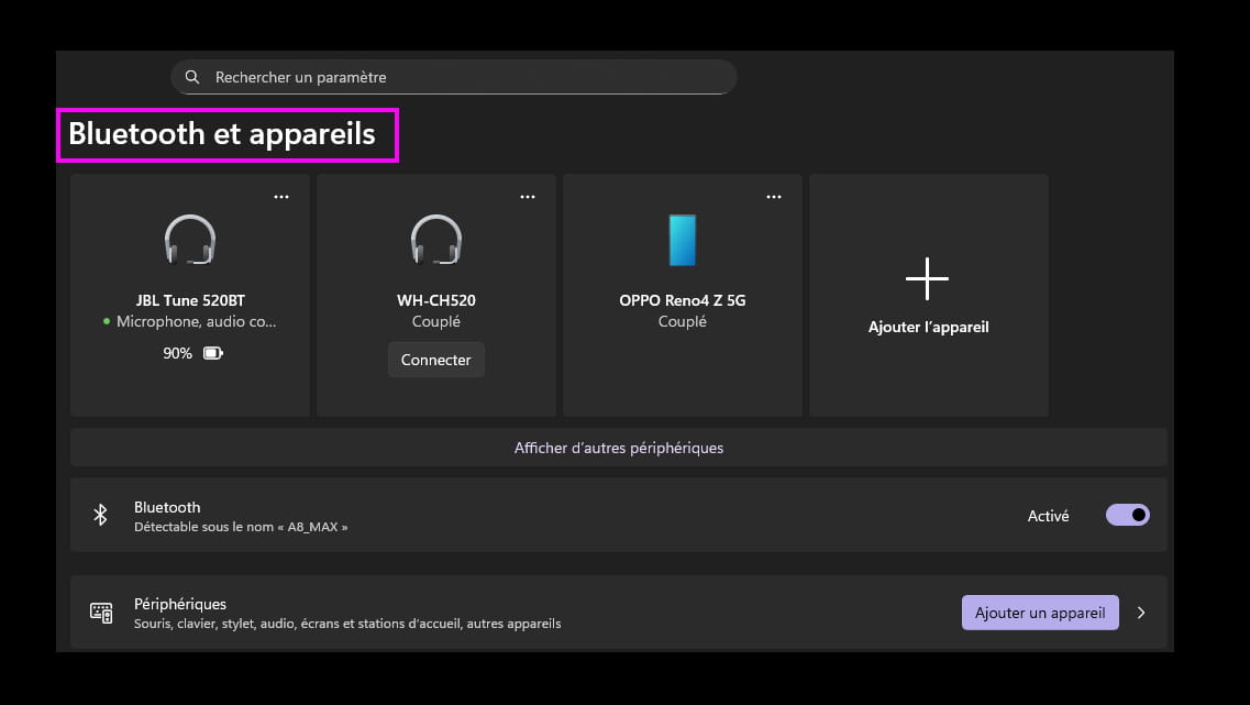 Ouvrir Paramètres sur W11--►Paramètres Bluetooth,appareils :
