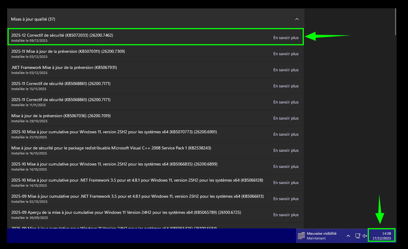 La dernière mise à jour Windows Update était sortie le 9 décembre 2025.