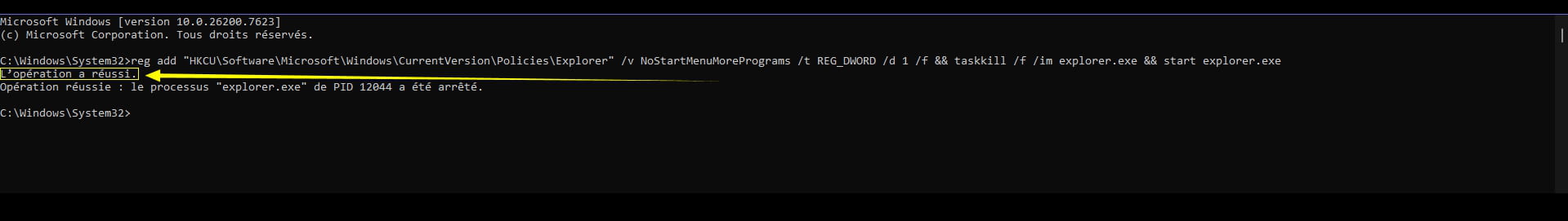 reg add "HKCU\Software\Microsoft\Windows\CurrentVersion\Policies\Explorer" /v NoStartMenuMorePrograms /t REG_DWORD /d 1 /f && taskkill /f /im explorer.exe && start explorer.exe