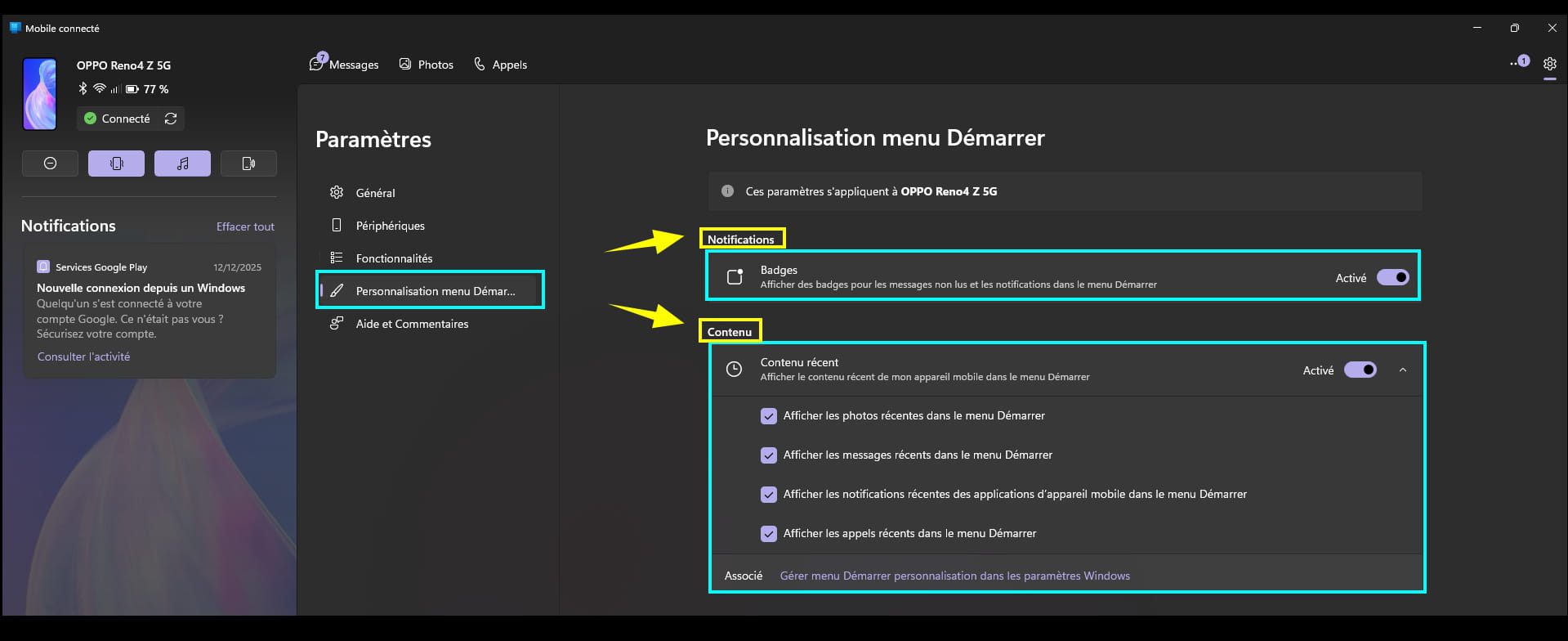 Parmi les autres nouveautés notables, la fonction Mobile connecté (Phone Link) devient accessible directement depuis le menu Démarrer. Elle affiche appels récents, SMS, photos et notifications en provenance d'un smartphone connecté, sans nécessiter l'ouverture de l'application dédiée du même nom.