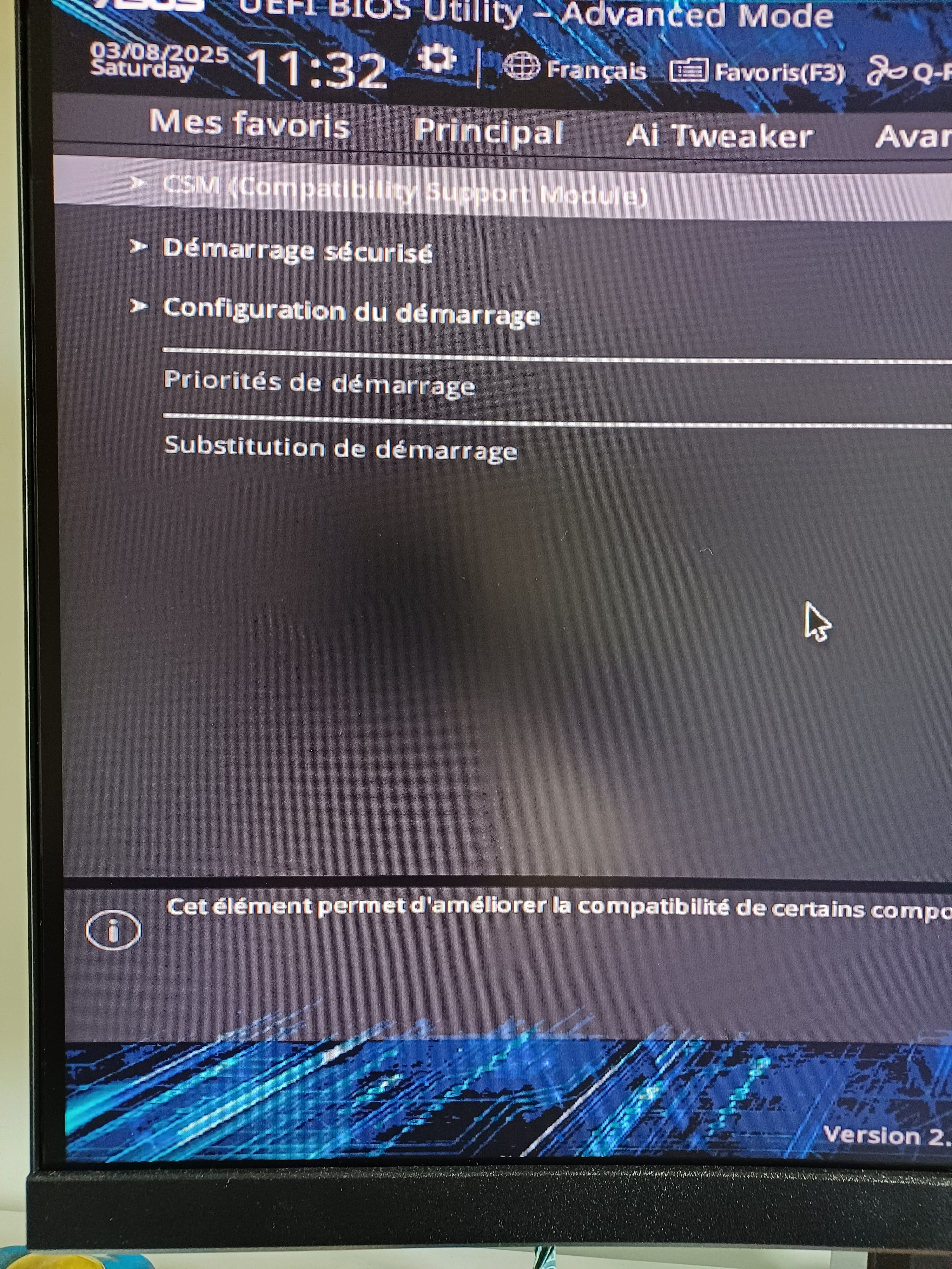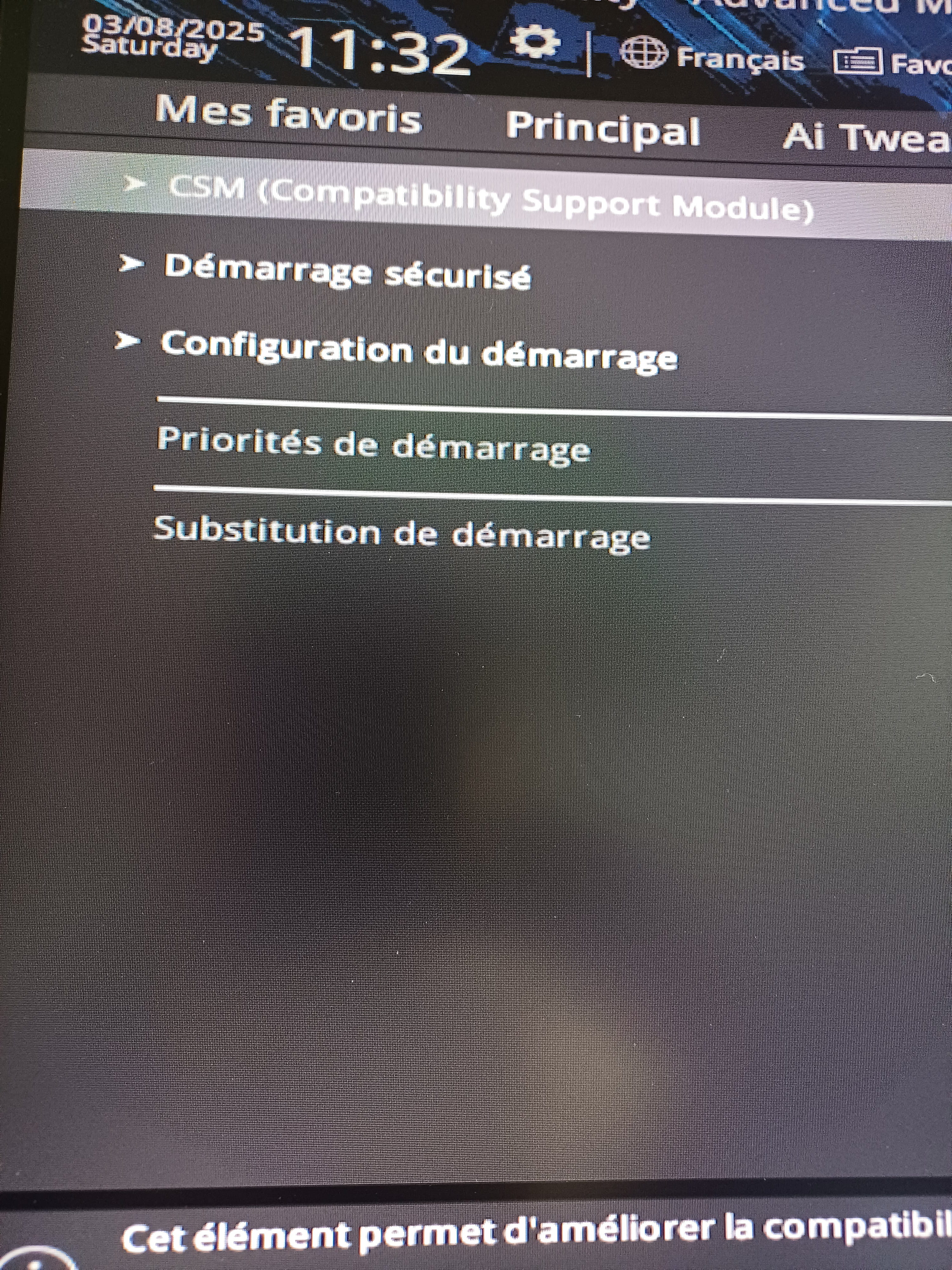 Je précise qu'il n'y avait pas ce problème avant que j'envoie la machine au SAV donc je ne pense pas que ce soit un problème de compatibilité avec la carte mère. J'ai regardé tous les tutos possibles et imaginables, retirer et remettre le ssd n'a pas marché et toutes les solutions à base de changements de paramètres du bios n'ont rien donné non plus soit parce que les paramètres n'existent pas sur mon bios (aucun paramètre lié au M.2) ou parce qu'ils sont grisés, ceux là entre autres