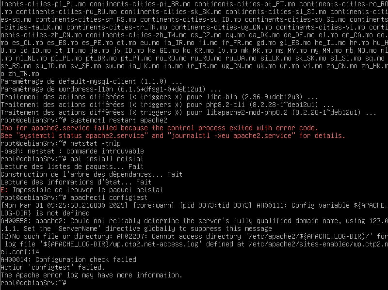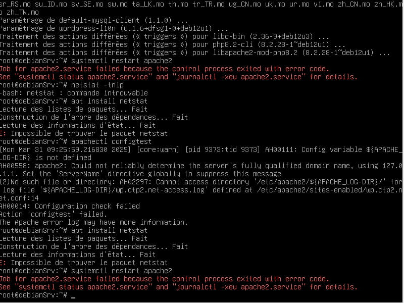 Déjà, il convient de lire ce que disent journalctl -xeu apache.service et autres ${$APACHE_LOG_DIR}/global.log