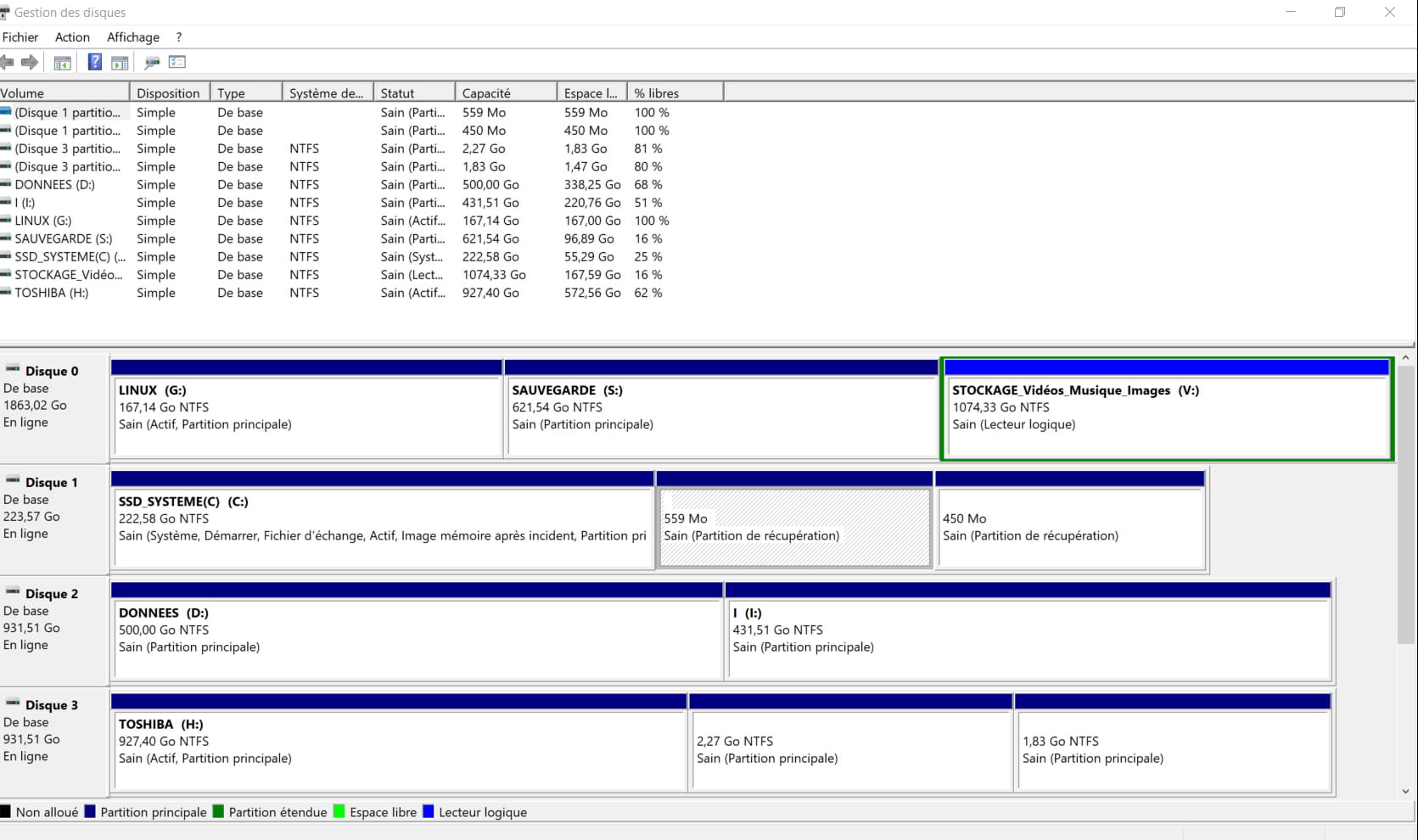 Pourquoi ne mets-tu pas une capture d'écran de ta Gestion des disques? Elle nous permettrait de nous faire une idée plus de l'organisation de tes disques et partitions.