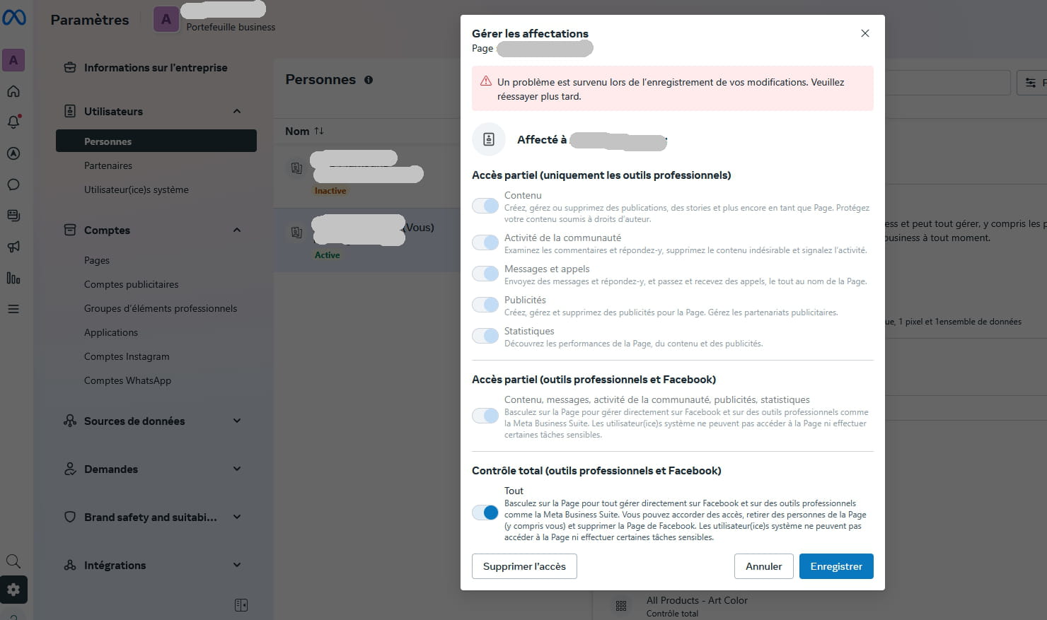 Je rencontre un problème sur mon compte Meta Business Manager. Lorsque j’essaie de m’attribuer le contrôle total sur une Page