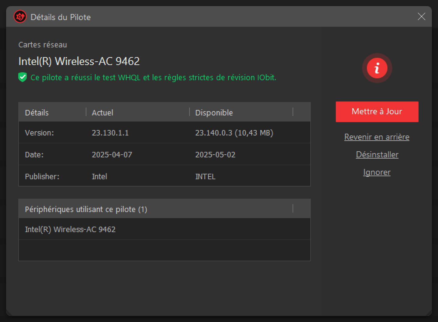 On a exactement la même carte WiFi, et la mienne n'a pas de problème avec le driver installé par IOBit Driver Booster (Giveaway)