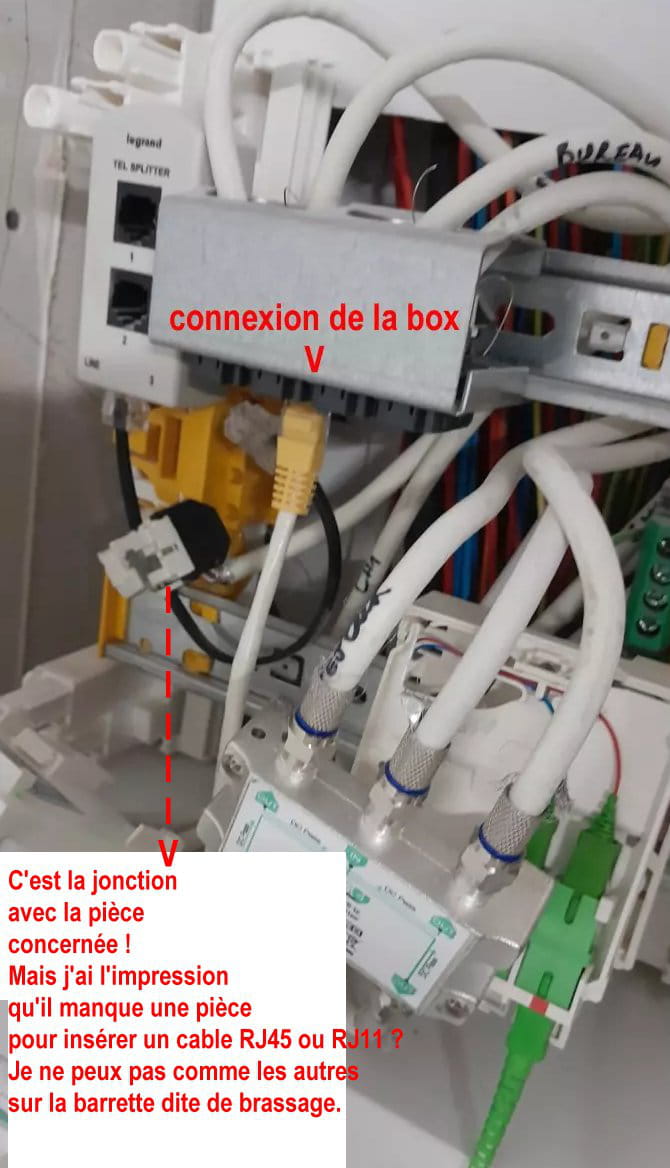 Si c'est ça > j'ai repéré le cable fibre de la pièce en question : Mais cette connexion n'est pas sur la barrette ou "brassage" (si j'ai bien compris" ?) . - J'ai l'impression qu'il manque quelque chose sur ce "domino fibre" pour connec