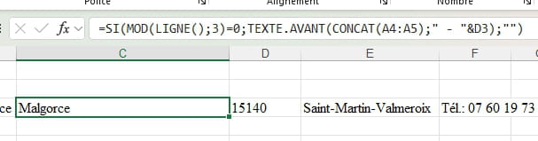 =SIERREUR(SI(MOD(LIGNE();3)=0;TEXTE.AVANT(TEXTE.APRES(CONCAT(A4:A5);" "&D3&" ");" - Tél");"");TEXTE.AVANT(TEXTE.APRES(CONCAT(A4:A5);" "&D3&" ");" -Tél"))