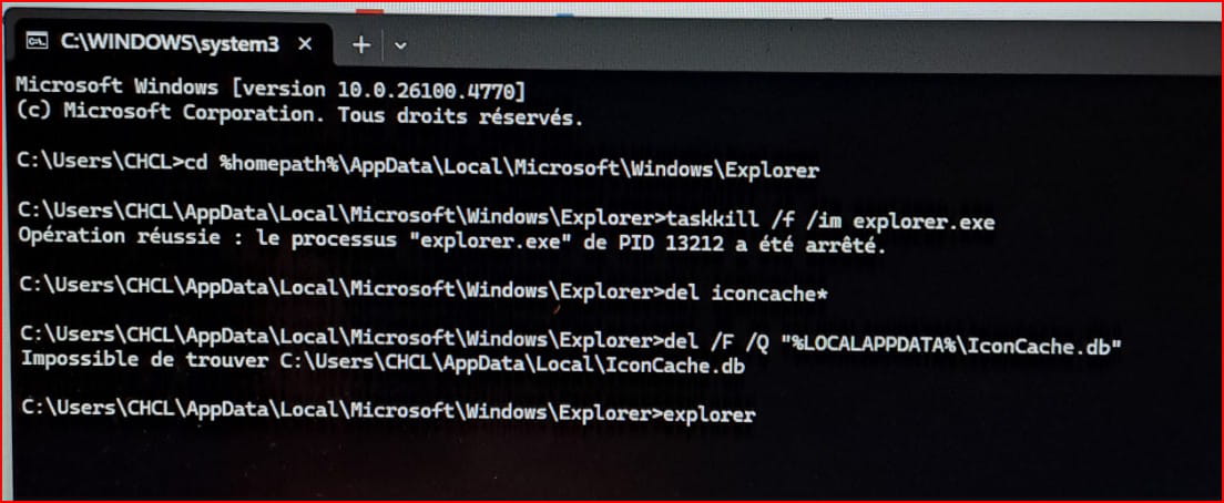 La quatrième ligne prescrit le chemin d'accès ce qui n'a pas de sens parce qu'on s'y trouve déjà ce qui n'a pas d'importance, mais surtout de supprimer Iconcache.db ce qui en a encore moins.