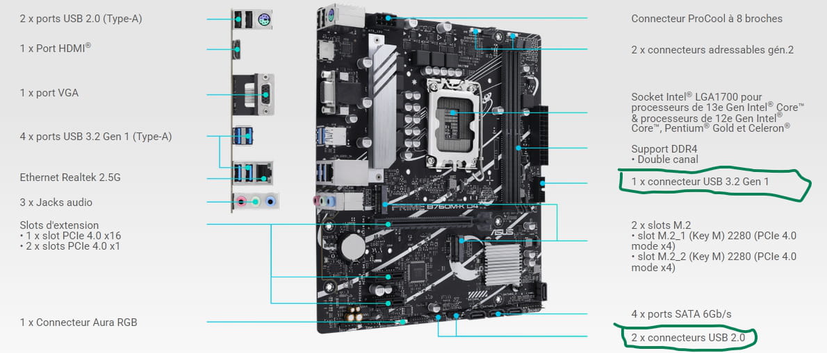 Là, j'ai bien un USB 1 et un USB 2.0 qui fonctionnent en façade.