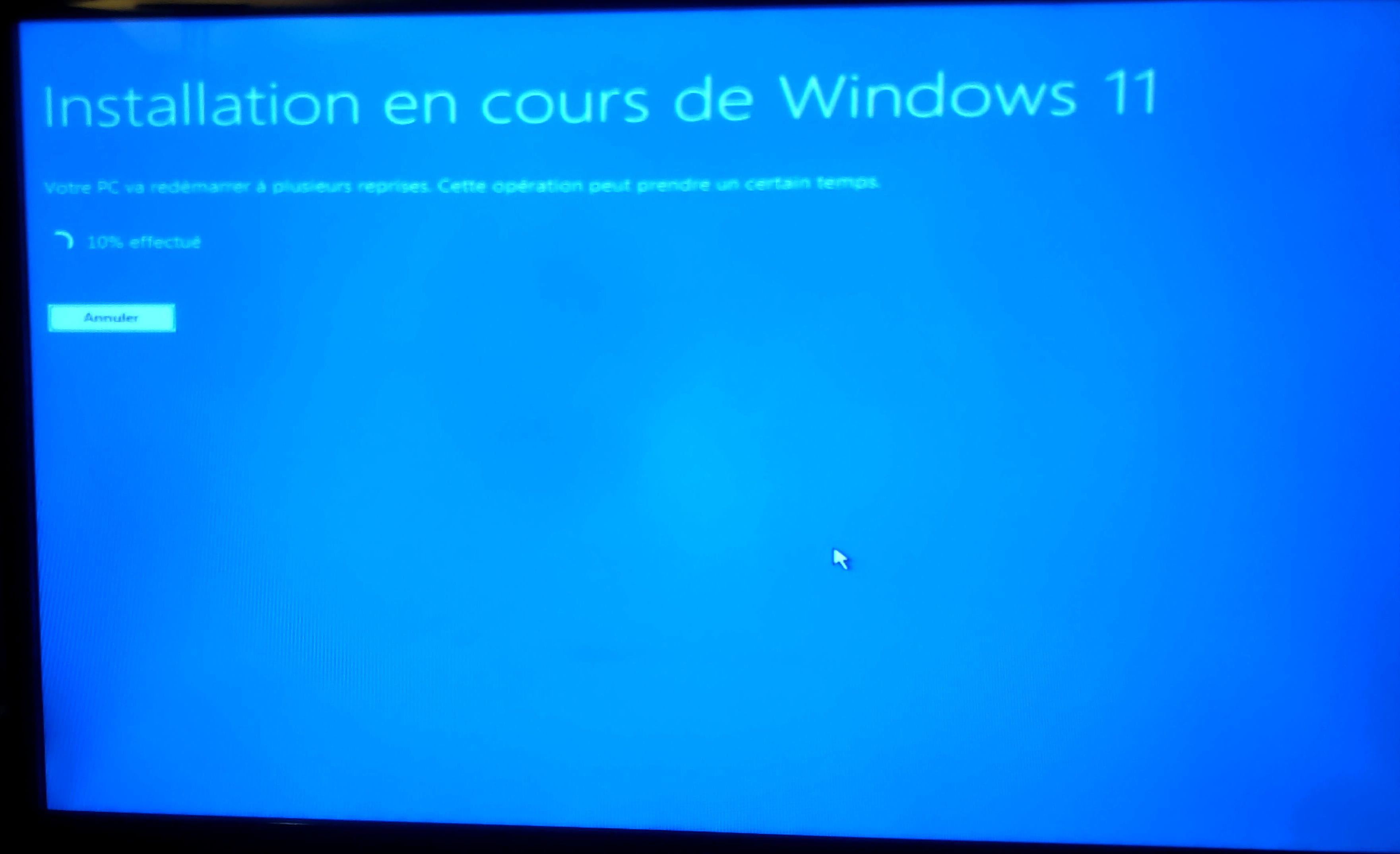 Ooops! je viens juste de lire ta dernière réponse. Alors j'ai réussi à lui faire reconnaître la clé USB et c'est parti pourl'install de WIN11 avec les bonnes et mauvaises surprises en cours de route....là part exemple il a rebooté et plus rien depuis 5 mn !! La LED d'activité du disque clignote mais rien de ne passe...
