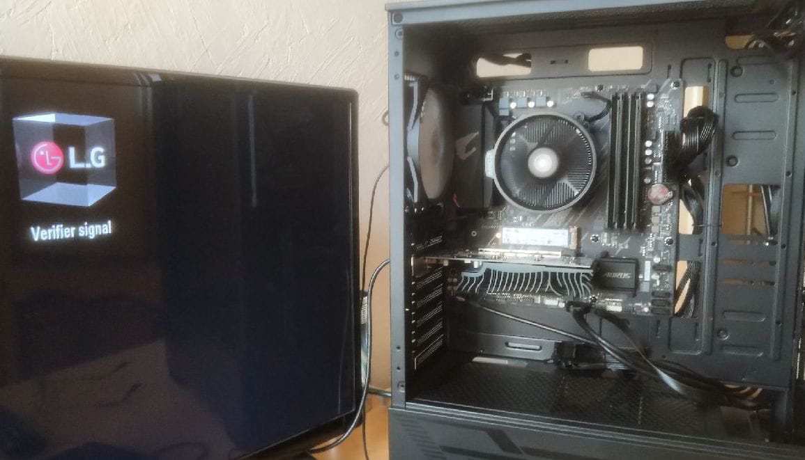 Bonjour à tous, j'ai monté tous les composants (CM, Proc, SSD, RAM, CG, ALIM) + connexion à un écran TV LG par câble HDMI sur la CG. Hum... le plus dur commence. Mise en marche OK, les ventilos fonctionnent, MAIS (photo ci-dessous) aucun signal n'est reçu par l'écran comme visible sur la photo.