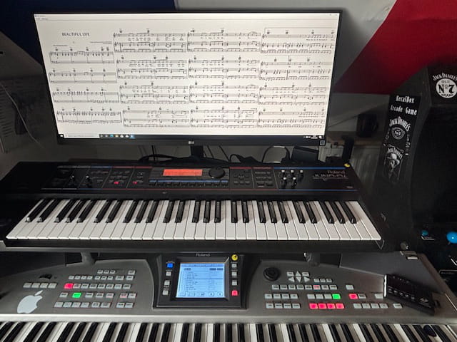 pour info, J'ai pris un 38pouces spécialement pour cela, et ayant collé une réglette en bas de l'écran, il me sert également écran éteint de support partitions papier.