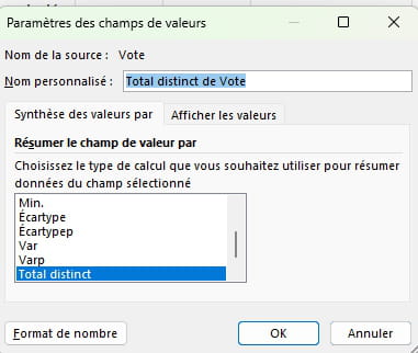 et, dans les paramètres du champ de valeur, choisir "Total distinct" :