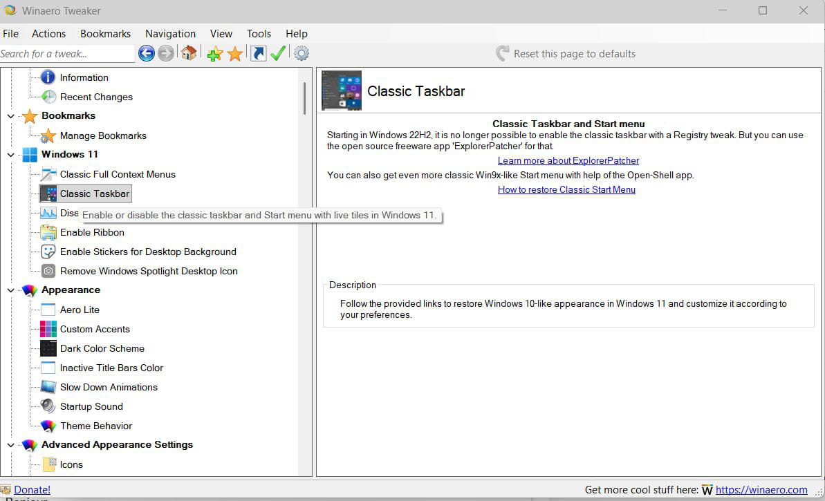 Je ne crois pas que Winaero fasse rien par lui-même, le paramètre idoine se contente de publier les liens vers Explorer Patcher et Open Shell.