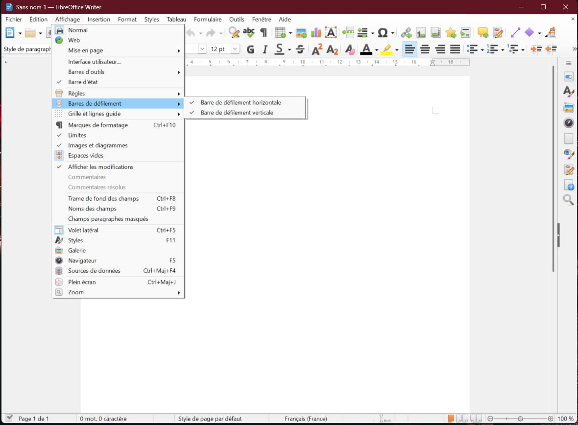 Donc voilà : dans Libre Office Writer, ma barre de défilement horizontale a disparu. Sur les forums, je vois bien des messages de gens ayant eu ce souci, mais, problème : toutes les réponses renvoient soit vers le menu "Affichage ==> Barre de défilement" où là, on rétablit la barre voulue, soit vers le menu outils ==> options ==> Affichage, où là aussi on trouve dans la fenêtre, une ligne qui concerne les barres de défilement