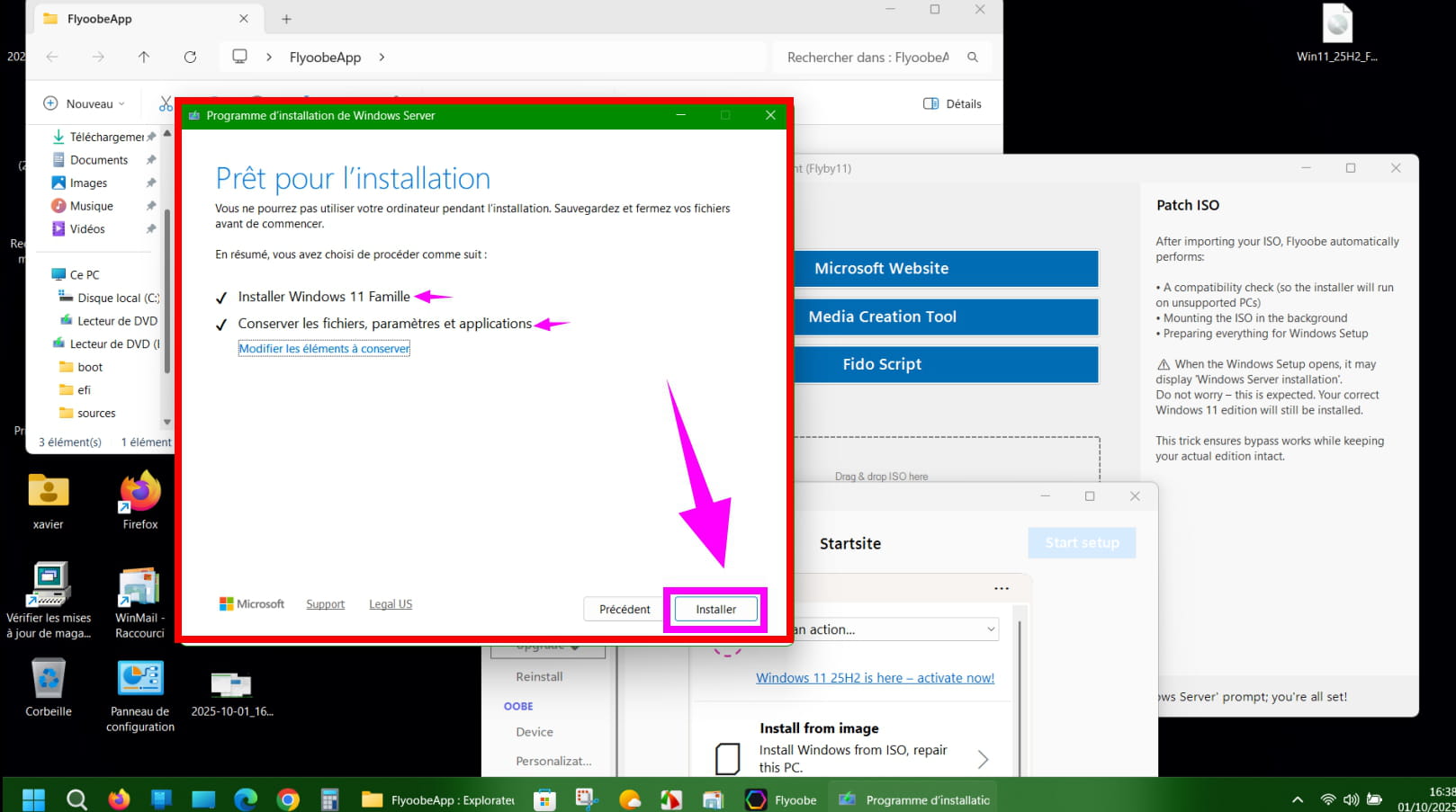 Suivez les instructions pour "installer" sans tout effacer, que les crochets verts qui montrent que vous conservez tout soient bien Ok.