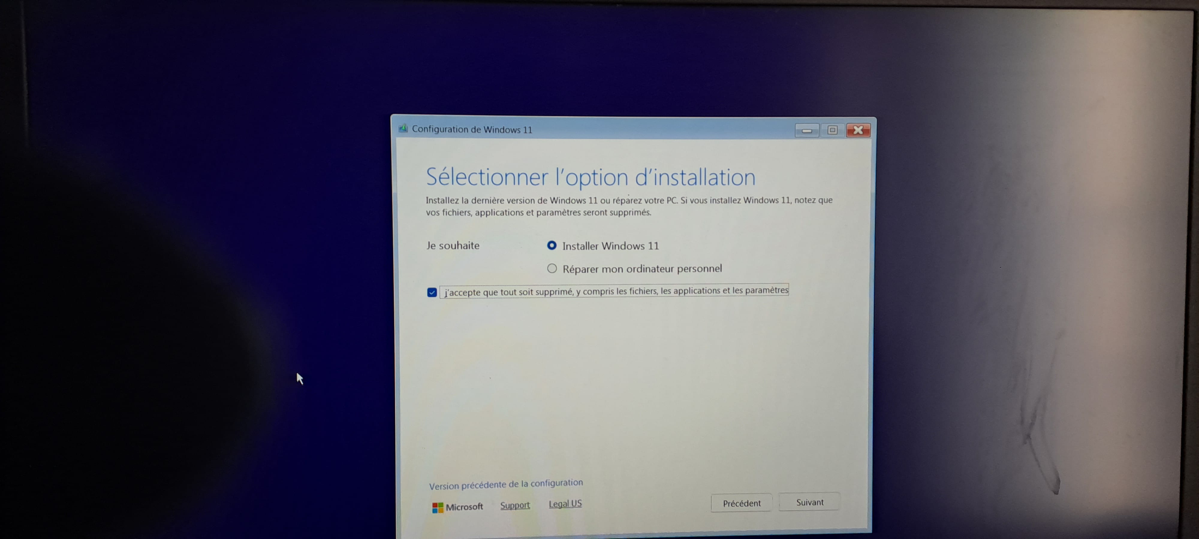 Voici mon problème : Je voudrais réinstaller Windows11 et en même temps supprimer les partitions de mon disque dur. J'ai aussi acheté une licence pour Windows. J'utilise une clé usb pour lancer l'application, mais Windows s'installe et ne me demande pas si je veux modifier le disque dur, ni la clé d'installation.