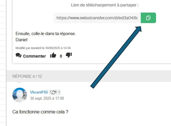 Clique sur "Cliquer pour ajouter vos fichiers". Vérifie que "Lien" est bien en vert, sinon, clique dessus. Clique sur "Transférer". Clique sur "Je ne suis pas un robot". Copie le lien affiché et colle-le dans ta réponse.