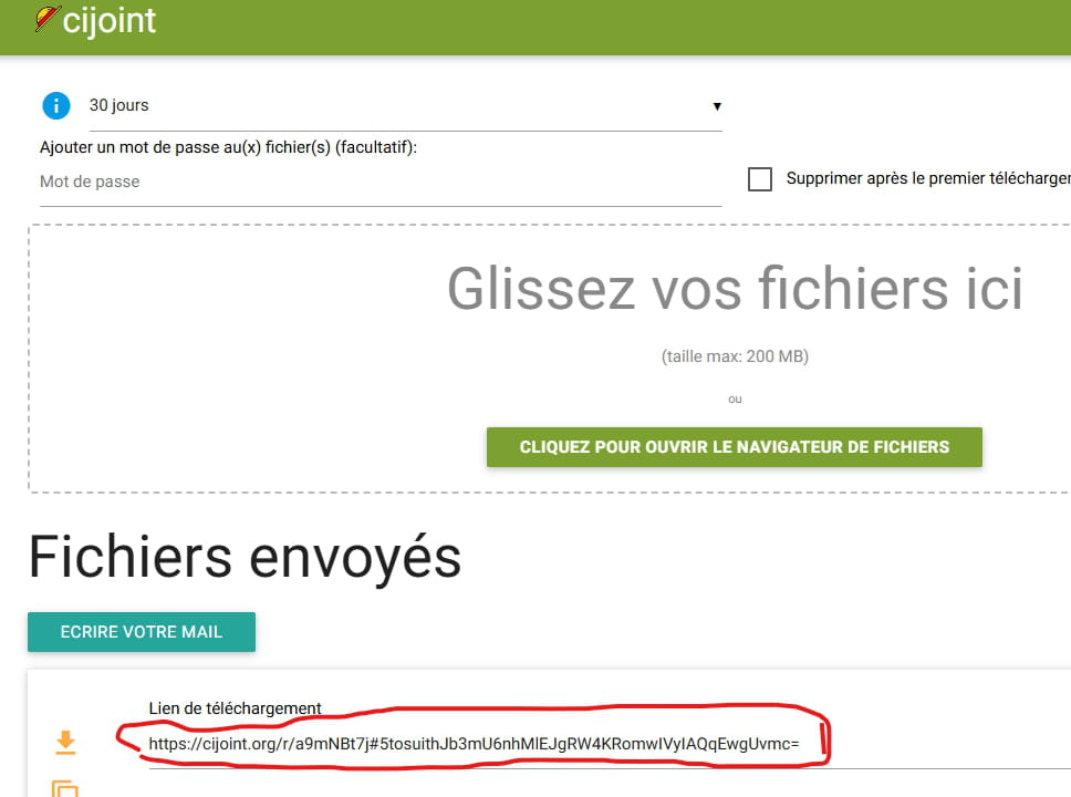 Si cela peut faire avancer le schmilblick j'utilise depuis la fermeture de cjoint cijoint que je trouve simple d'emploi sans un parcours du combattant pour mettre son fichier en ligne ou pour le récupérer.