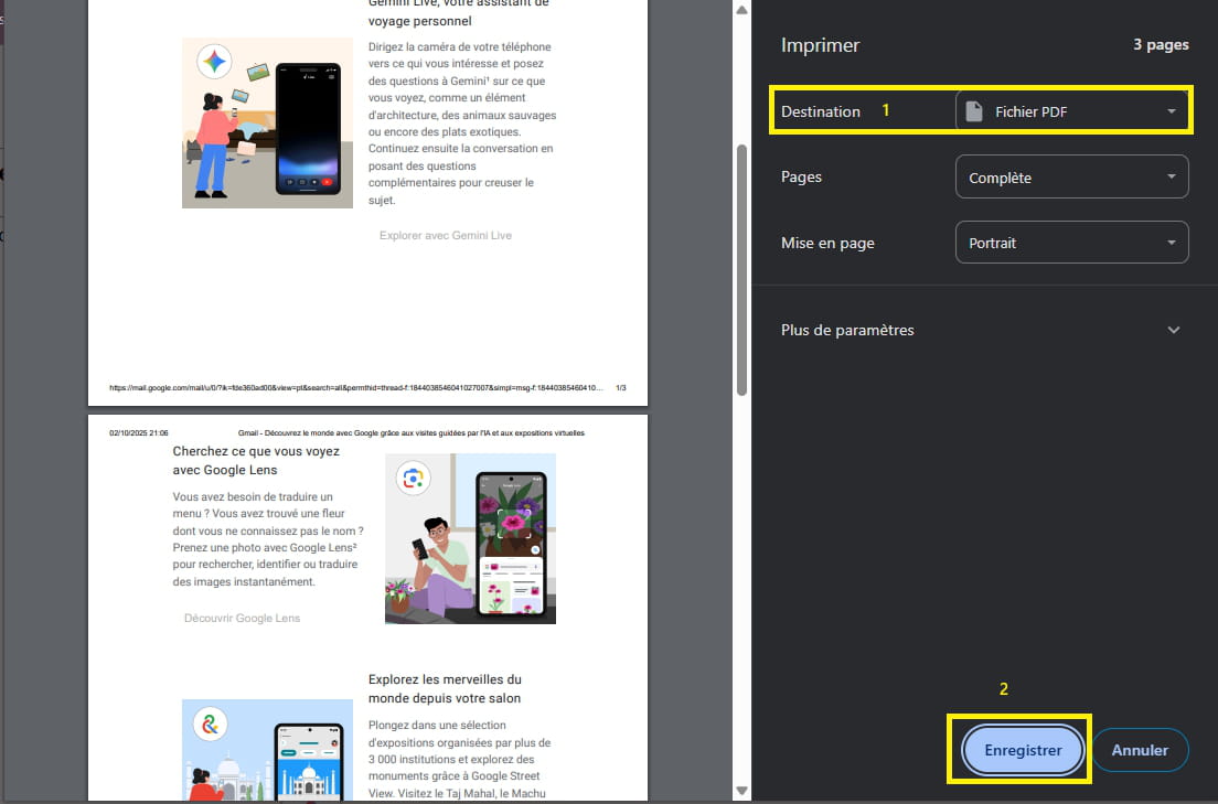 Sur Gmail - ouvrir le mail cliquer sur l'imprimante en haut et à droite - choisir l'imprimante PDF - Nommer le fichier - cliquer sur Enter
