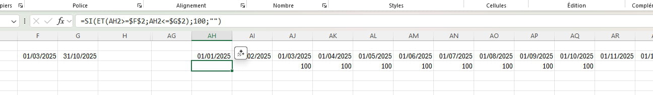 Je voudrais que lorsque je rentre des dates d'entrées et de sorties, les cellules AH; AI; AJ; ................. me mette une somme de 100 € sur chaque mois de présence.