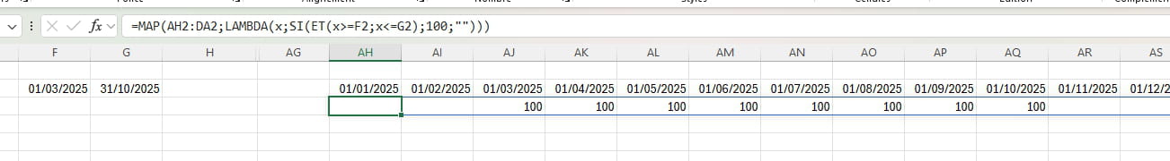=MAP(AH2:DA2;LAMBDA(x;SI(ET(x>=F2;x<=G2);100;"")))
