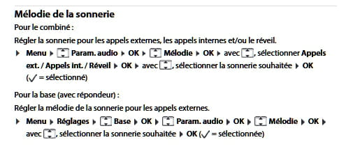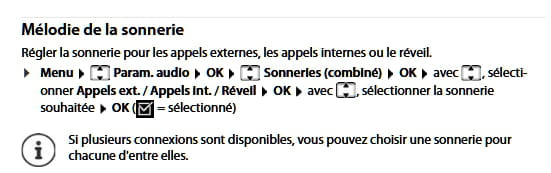 Vous pouvez choisir, pour le(s) combiné(s) des mélodies de sonneries différentes entre les appels externes, les appels internes et le réveil (notice page 37 § Mélodie de la sonnerie).
