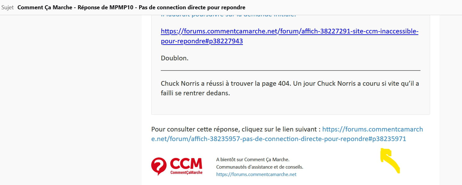 Je continue a avoir ce probleme de connection quand je veux repondre en cliquant sur le lien donné. Je dois donc ouvrir CCM et aller dans mes sujets [a droite] pour pouvoir le faire... un peu ennuyeux.