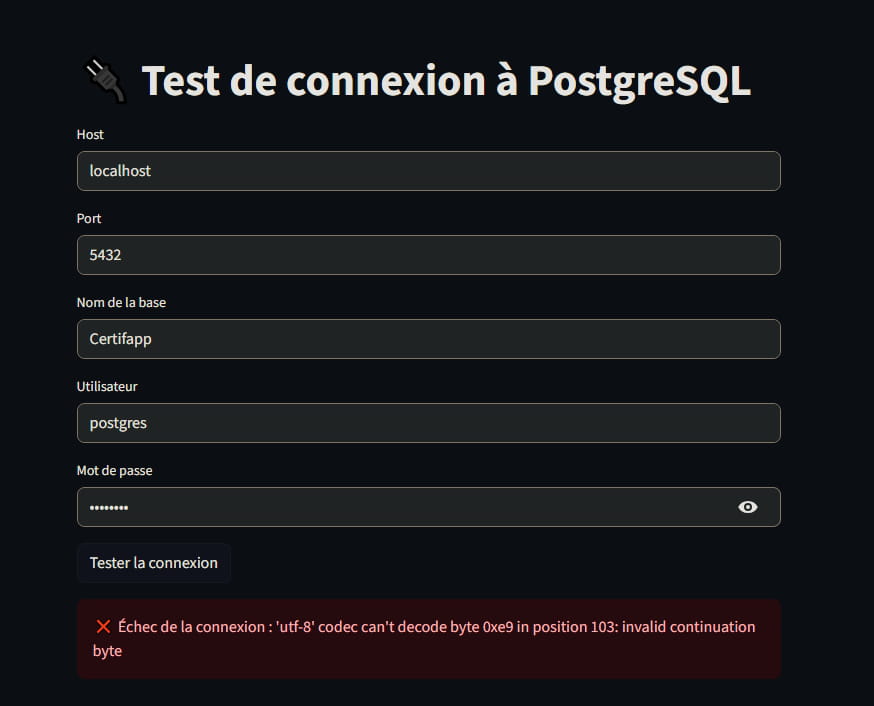 import streamlit as st import psycopg2 st.title("???? Test de connexion à PostgreSQL") # Formulaire pour saisir les paramètres de connexion host = st.text_input("Host", value="localhost") port = st.text_input("Port", value="5432") dbname = st.text_input("Nom de la base", value="Certifapp") user = st.text_input("Utilisateur", value="postgres") password = st.text_input("Mot de passe", type="password", value="changeMe") # Bouton pour tester la connexion if st.button("Tester la connexion"): try: conn = psycopg2.connect( host=host, port=port, dbname=dbname, user=user, password=password, options='-c client_encoding=UTF8' ) st.success("✅ Connexion réussie à la base de données PostgreSQL !") #conn.close() except Exception as e: st.error(f"❌ Échec de la connexion : {e}")