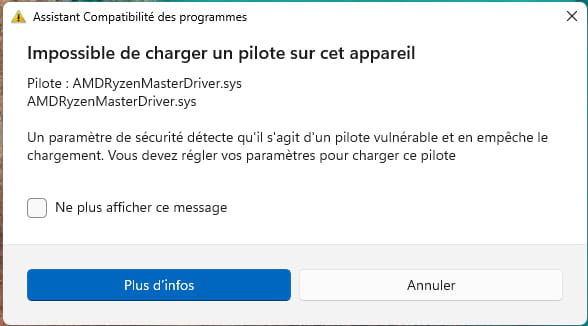 Un message d'alerte lorsque j'allume mon PC s'affiche et indique qu'il est impossible de charger un pilote sur cet appareil (screen joint)