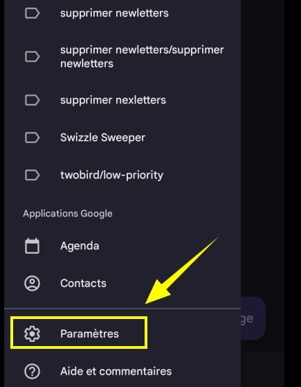 Descendre dans le menu tout en bas puis cliquer ou appuyer sur ''Paramètres'' :