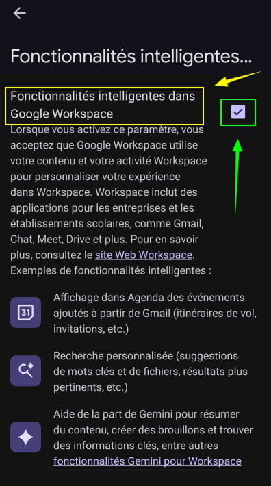 Idem pour l'option '' Fonctionnalités intelligentes dans Google Worksapace'' si la procédure à était appliquée (à la lettre) :