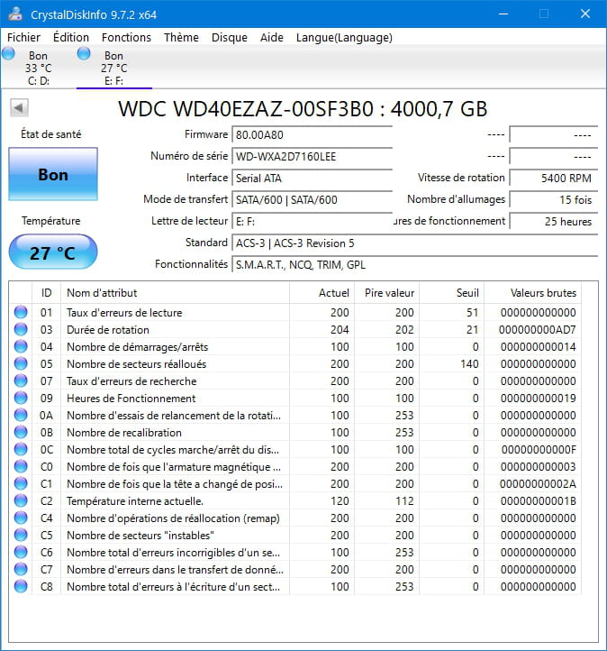Ce bruit doit être provoqué par la tête de lecture qui se met à l'arrêt. Vérifions l'état de santé du disque dur avec CrystalDiskInfo.