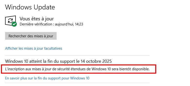 Sur mon portable sous W10 (incompatible W11), je réponds à toutes les recommandations et pourtant, dans "Windows Update", il n'y a pas "Inscription à l'ESU" !