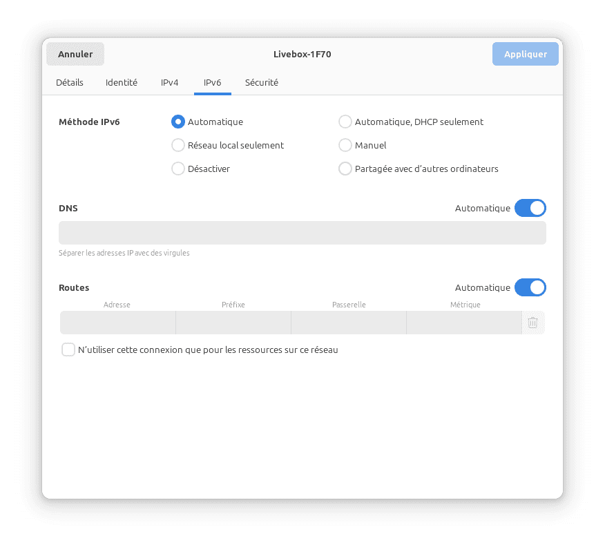 Il y a un menu pour CHAQUE type de connexion (Wifi, Filaire) il faut choisir le cas échéant successivement chaque type, puis le cas échéant modifier les DNS dans CHAQUE protocole IPV4 et IPV6: