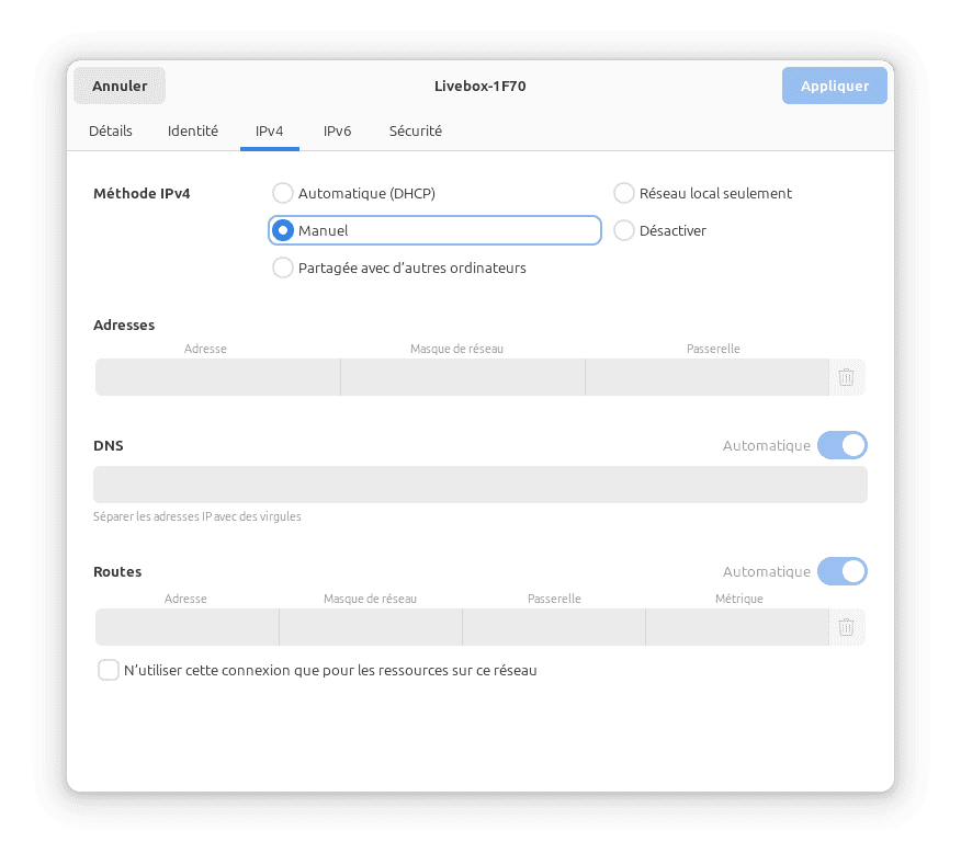 Cliquer la roue dentée en bas à droite, décocher automatique en face de DNS puis entrer ses paramètres DNS, faire + et Appliquer: