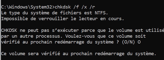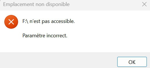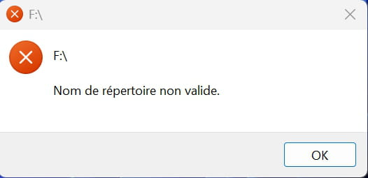 Le chkdsk vous l'avez tenté sur C: Sinon il faut spécifier la lettre avec 2 points après chkdsk /R F:
