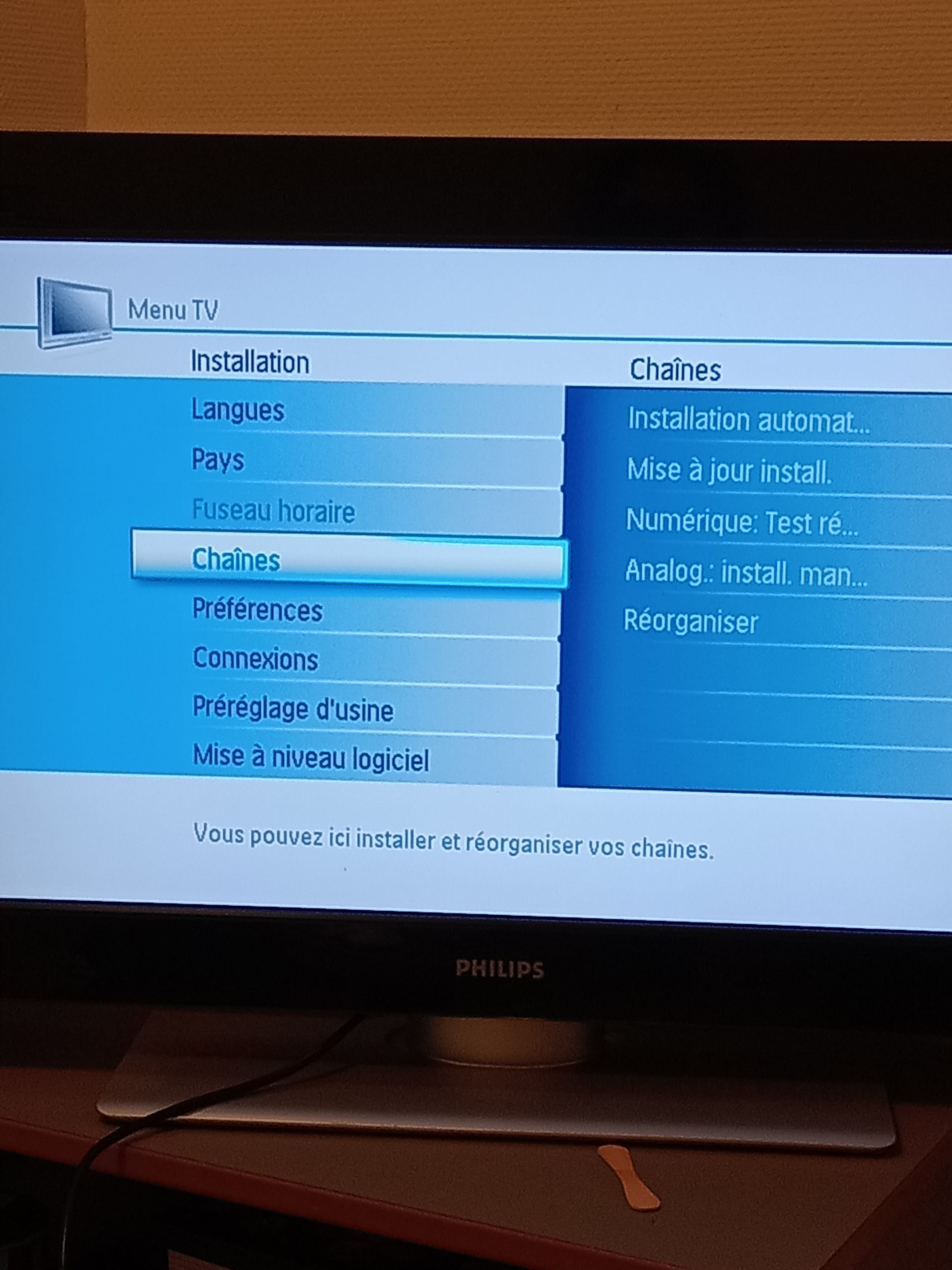 La photo d'écran que vous nous montrez ("Chaines" en surbrillance) concerne le recherche de chaines si le téléviseur est connecté à une prise d'antenne.