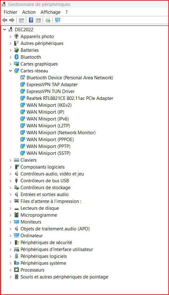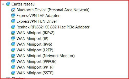 J'ai fait une photo de la liste des cartes réseau apparaissant dans le "Gestionnaire de périphériques",